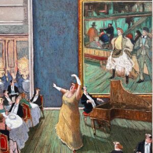の飾られた美術館で犬の散歩を楽しむ人たち。