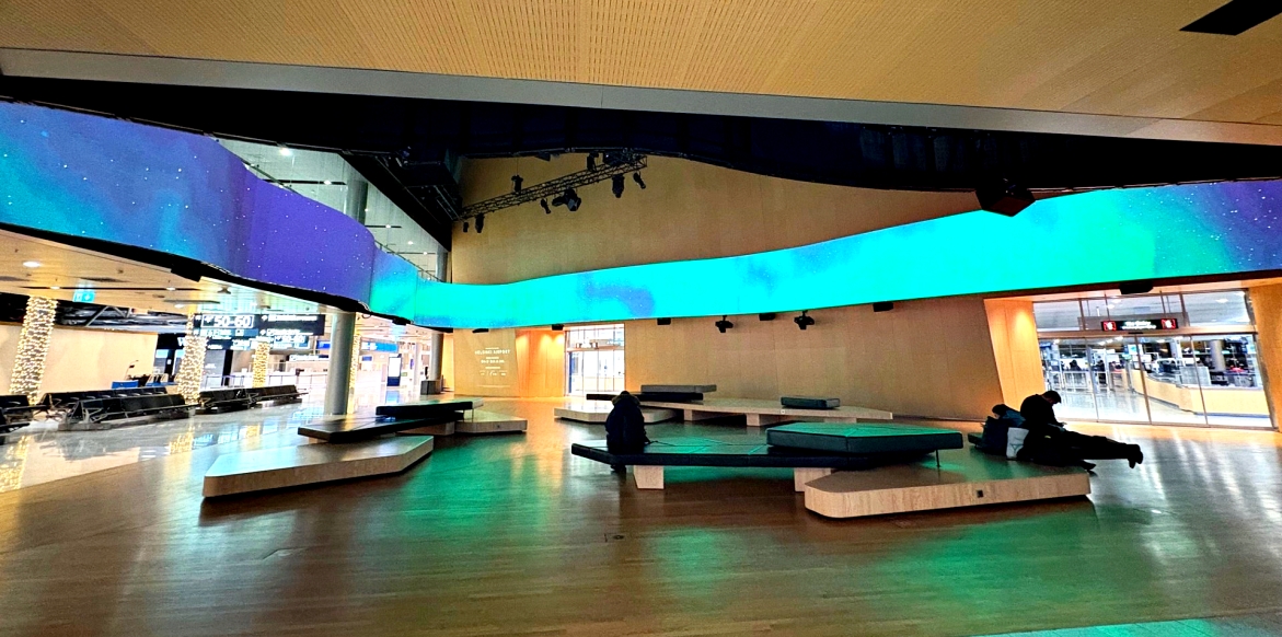 この上の水色の帯は、本日は夜空とオーロラが輝いていましたよ。秋には秋の森の様子が、冬には雪景色が映像で写されるのです。もう最寄りの駅のようにしょっちゅう利用するので全季節見た気がしますね(笑)